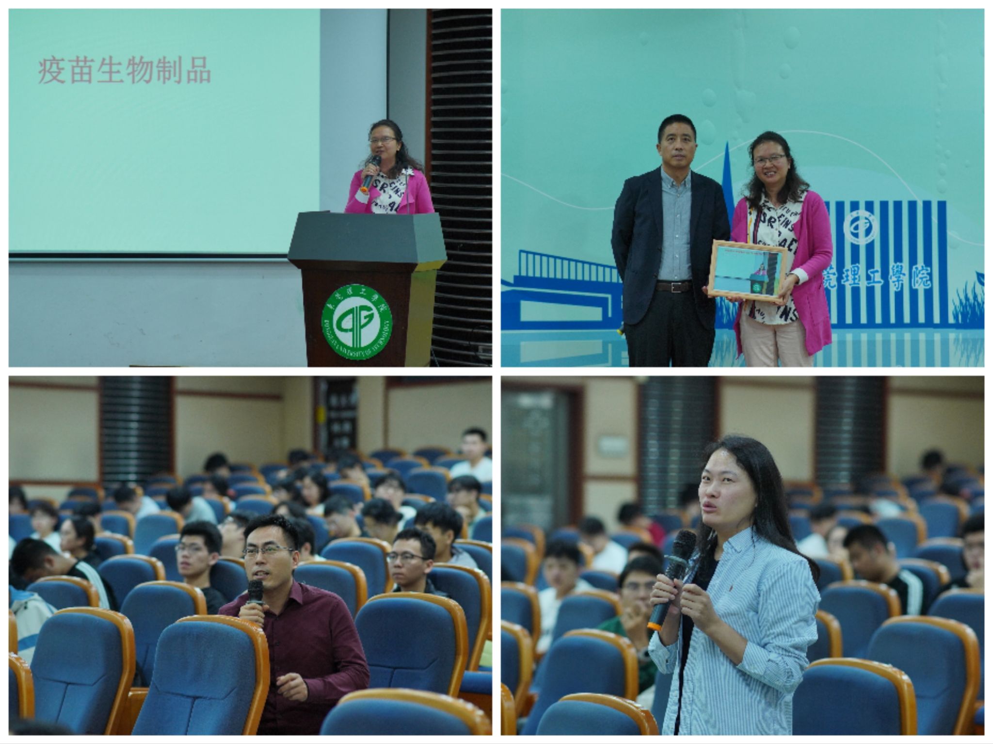 在专题报告环节,刘昕博士作了题为《疫苗生物制品的科学内涵与技术实践》的专题讲座。刘博士凭借其深耕疫苗生物制品领域20 多年的丰富经验,为师生们系统介绍了疫苗的发展史、疫苗研发过程及研发周期等内容。刘博士强调,一款疫苗从临床研究到完成五期试验获批,国内通常需要10年左右,国外最快也需8年,研发过程需经过严格的安全性与有效性验证,没有三期临床试验数据的疫苗无法被认定为有效疫苗。现场互动环节,师生们围绕疫苗领域热点问题与刘昕博士展开深入交流探讨。讲座结束后,王际辉经理为刘昕博士赠送了纪念品并合影留念。