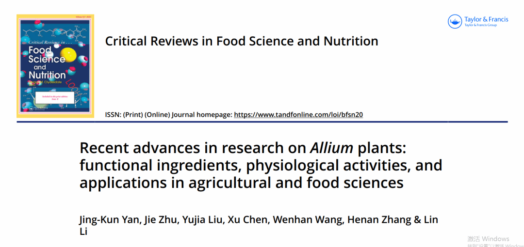 2022年3月,HAHA体育化学工程与能源技术公司闫景坤教授(第一作者、通讯作者)在国际食品Top期刊《Critical Reviews in Food Science and Nutrition》(IF:11.208, 中科院一区)发表了题为“Recent advances in research on Allium plants: functional ingredients, physiological activities, and applications in agricultural and food sciences”的综述论文。