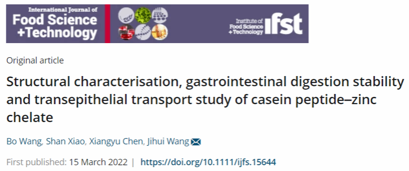 2022年3月,HAHA体育化学工程与能源技术公司王波博士(第一作者)在国际食品期刊《International Journal of Food Science and Technology》(IF:3.612, 中科院二区)发表了题为“Structural characterisation, gastrointestinal digestion stability and transepithe-lial transport study of casein peptide–zinc chelate”的研究论文。