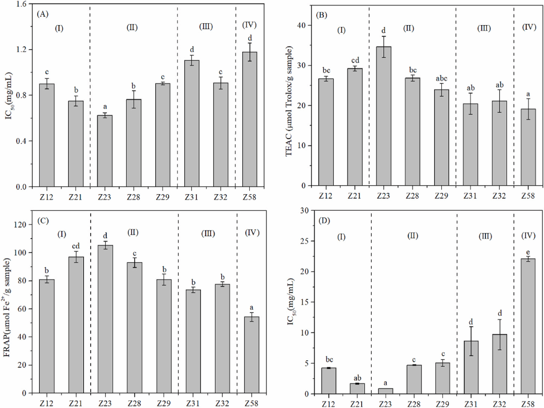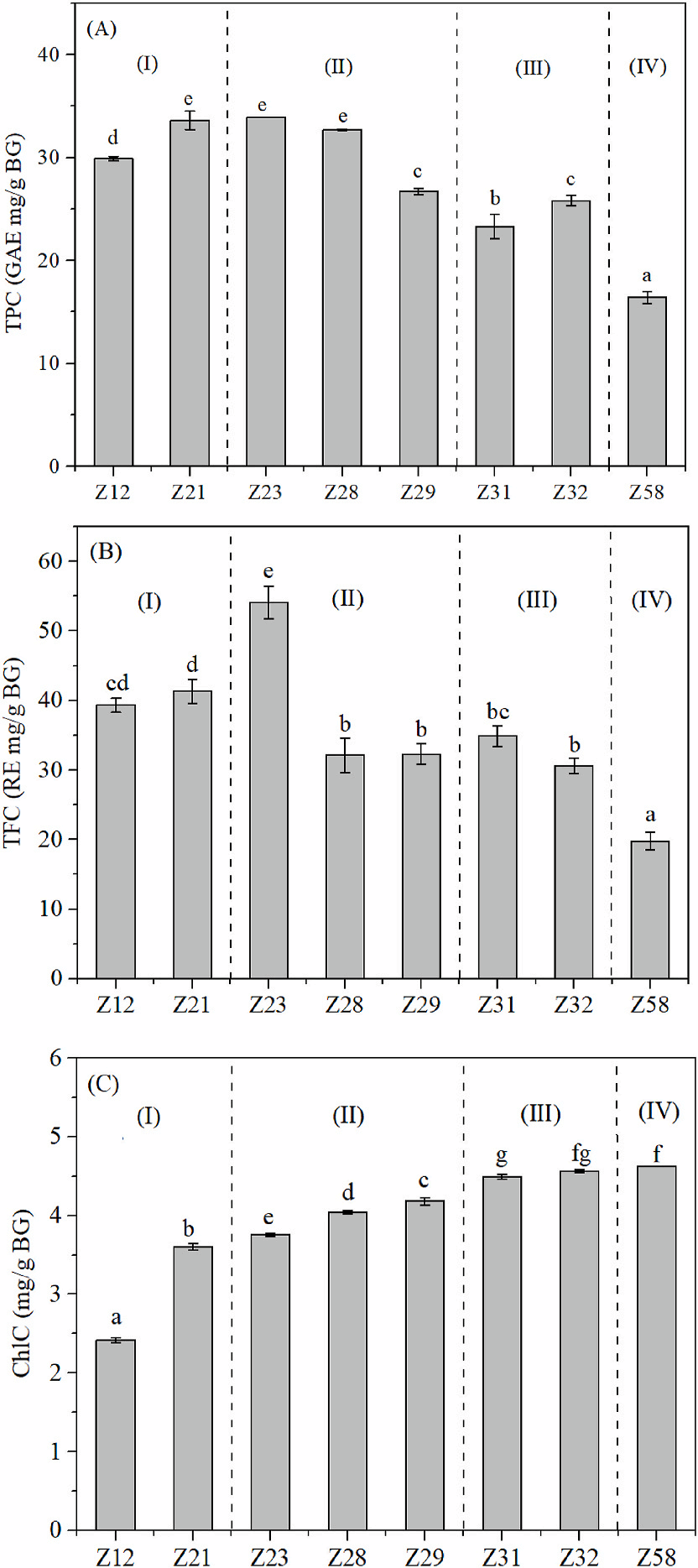 结果表明,大麦苗的生长时期显著影响大麦苗的基本组成、色泽和氨基酸组成。大麦苗的体外生物活性与总酚含量、总黄酮含量、蛋白质含量和总氨基酸含量成正相关的关系。其中,在苗期Z21和分蘖初期Z23采收的大麦苗总酚含量和总黄酮含量均高于其他组的大麦苗,并显示出较高的抗氧化能力和α-葡萄糖苷酶抑制活性。这项研究工作表明分蘖早期是大麦苗较好的采收时期,具有良好的产品质量和生物活性。