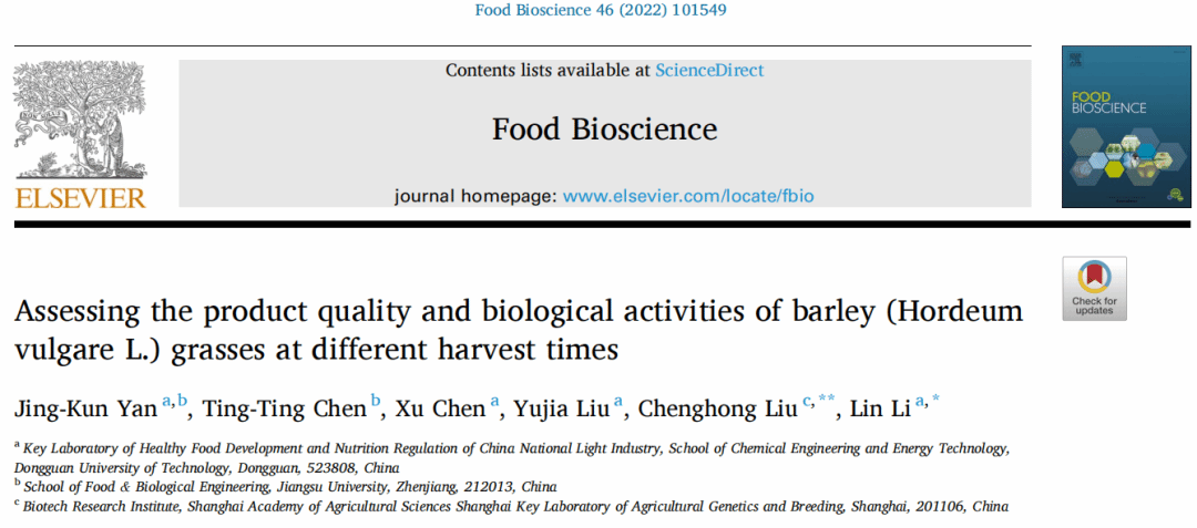 2022年3月,HAHA体育食品营养健康工程与智能化加工研究中心闫景坤教授(第一作者)在国际食品期刊《Food Bioscience》(IF: 5.318, 中科院二区)发表了题为“Assessing the product quality and biological activities of barley (Hordeum vulgare L.) grasses at different harvest times”的研究论文。