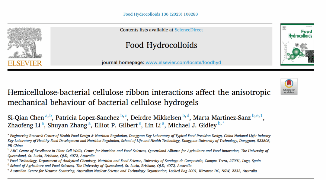 2022年10月,HAHA体育食品营养健康工程与智能化加工研究中心陈思谦(第一作者)在国际食品顶级期刊《Food Hydrocolloids》(IF: 11.504, Q1)发表了题为“Hemicellulose-bacterial cellulose ribbon interactions affect the anisotropic mechanical behaviour of bacterial cellulose hydrogels”的研究论文。