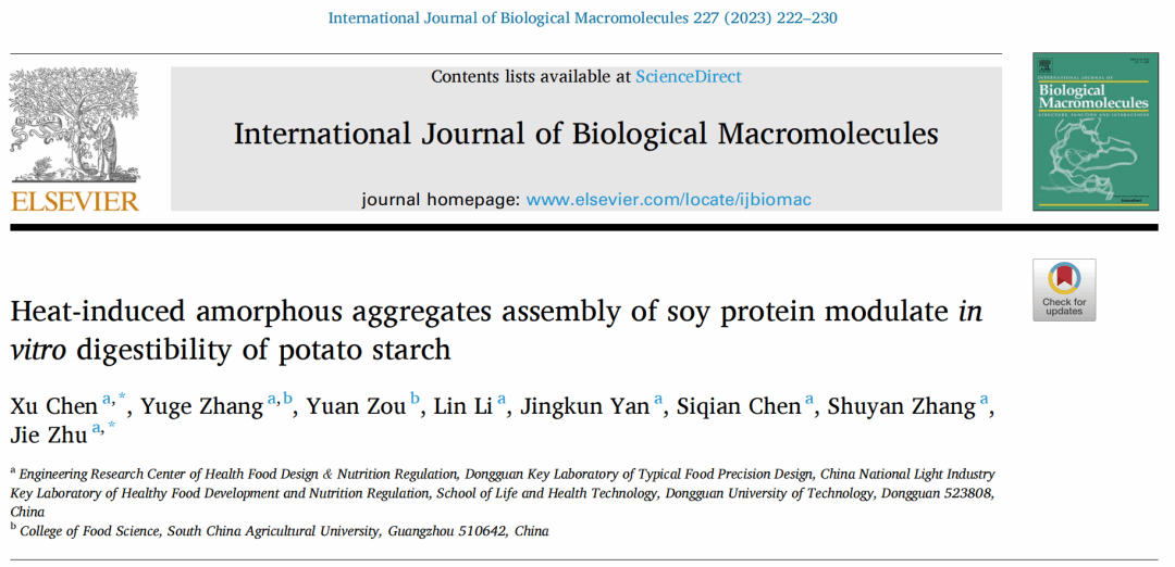 2022年12月,HAHA体育食品营养健康工程与智能化加工研究中心陈旭博士(第一作者兼通讯作者)和朱杰副教授(通讯作者)在国际食品顶级期刊《International journal of biological macromolecules》(IF: 8.025, Q1 TOP)发表了题为“Heat-induced amorphous aggregates assembly of soy protein modulate in vitro digestibility of potato starch”的研究论文。
