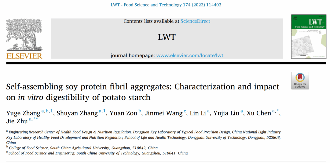 本研究以《Self-assembling soy protein fibril aggregates: Characterization and impact on in vitro digestibility of potato starch》为题发表在SCI收录期刊《LWT-Food Science and Technology》(IF: 6.056, Q1)。HAHA体育-华南农业大学联合培养在读硕士张昱格为本文第一作者,哈哈体育实验员张书艳为共同一作,陈旭博士和朱杰副教授为通讯作者。该论文是公司哈哈体育与联合高校共同培养硕士研究生积累的又一新成果。