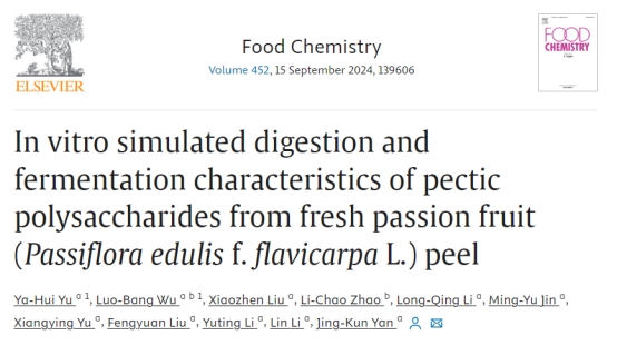2024年5月11日,公司闫景坤教授团队于国际食品顶级期刊《Food Chemistry》在线发表题为“In vitro simulated digestion and fermentation characteristics of pectic polysaccharides from fresh passion fruit (Passiflora edulis f. flavicarpa L.) peel”的研究性文章。论文第一作者为于亚辉博士,通讯作者为闫景坤教授。