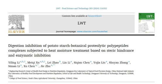 2024年7月14日,公司朱杰教授团队于国际食品顶级期刊《LWT-Food Science and Technology》(中科院一区Top期刊)在线发表题为“Digestion inhibition of potato starch-botanical proteolytic polypeptides complexes subjected to heat moisture treatment based on steric hindrance and enzymatic inhibition”的研究性文章。硕士研究生李益玲为第一作者、徐美琪为共同第一作者,朱杰教授和陈旭副教授为通讯作者。