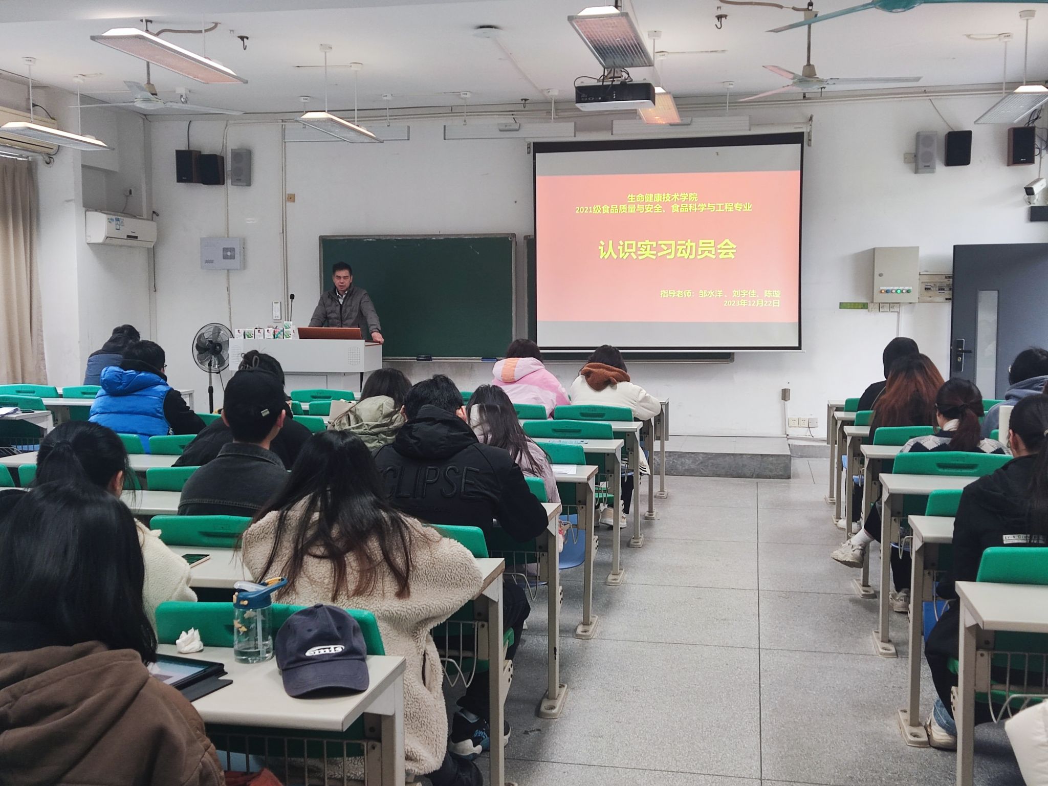 公司于12月22日先行召开了认识实习动员会,会议由营养与健康系主任刘宇佳老师主持。会上,刘宇佳老师对认识实习的意义、任务和要求做了讲解,邹水洋老师强调了实习过程的安全与纪律问题,并勉励同学们通过实习掌握必要的生产工艺、食品检验及管理经营知识,为学习后续专业知识打下良好基础。