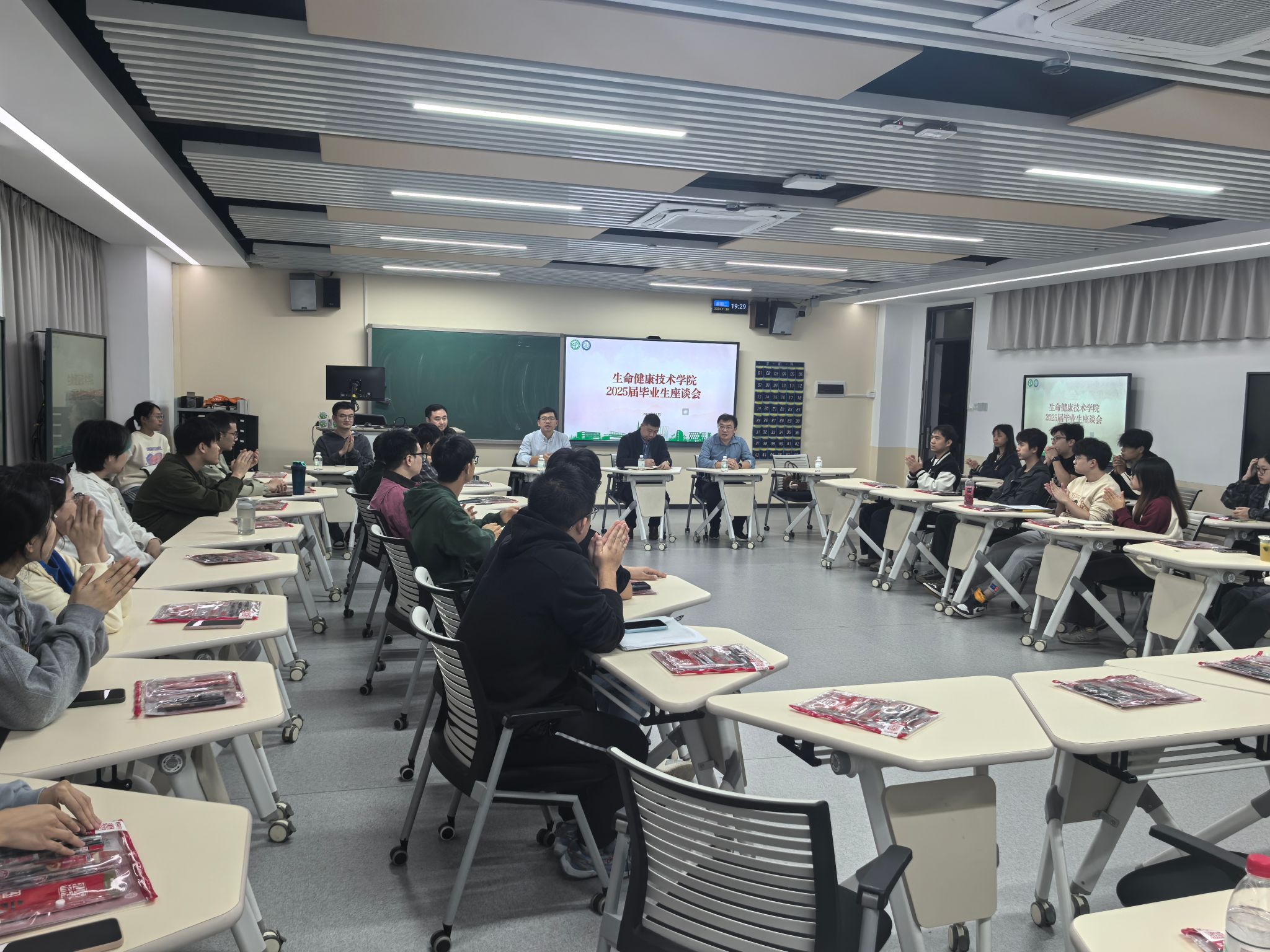 为进一步了解2025届毕业生的在校学习生活情况,掌握同学们的就业现状及期望需求,提高工作针对性,哈哈体育于11月26日晚在6D303举行2025届毕业生座谈会。公司党委书记谢炯标,党委副书记葛金虎,副经理闫景坤,营养与健康系主任刘宇佳,辅导员杨梅青、刘文渊及2025届毕业生参加此次座谈会。